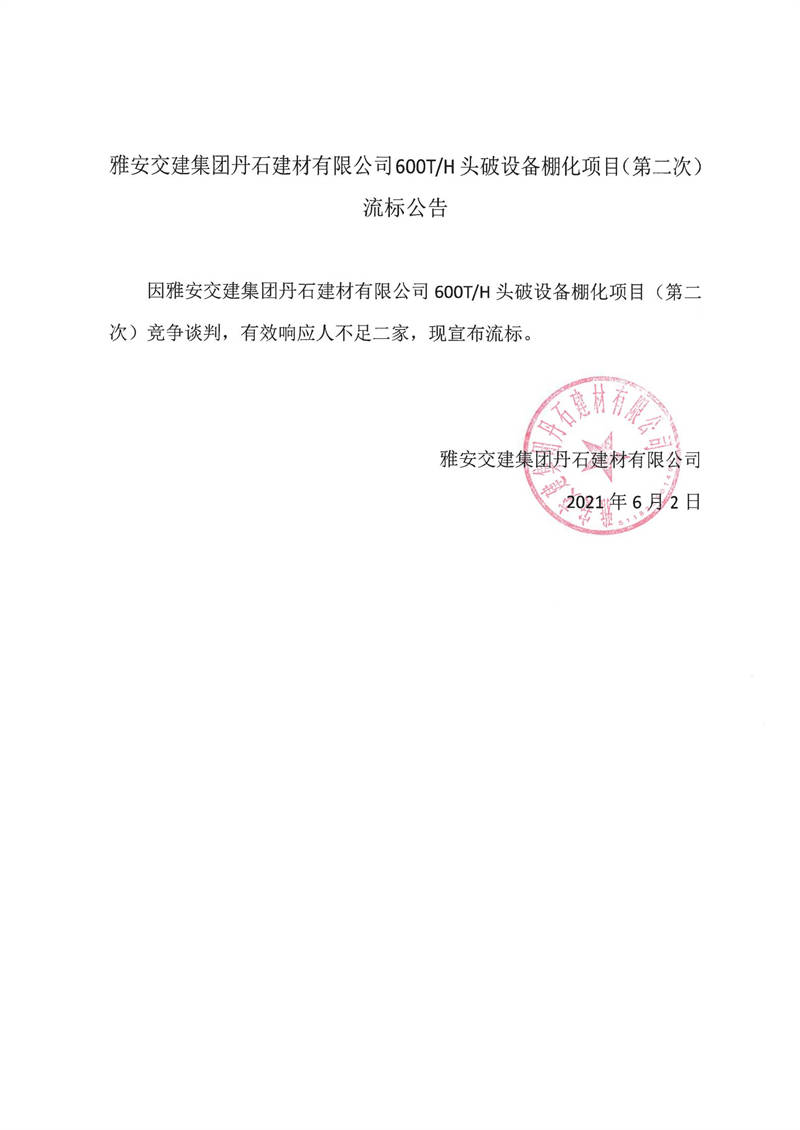 雅安交建集團(tuán)丹石建材有限公司600T/H頭破設(shè)備棚化項(xiàng)目(第二次)流標(biāo)公告