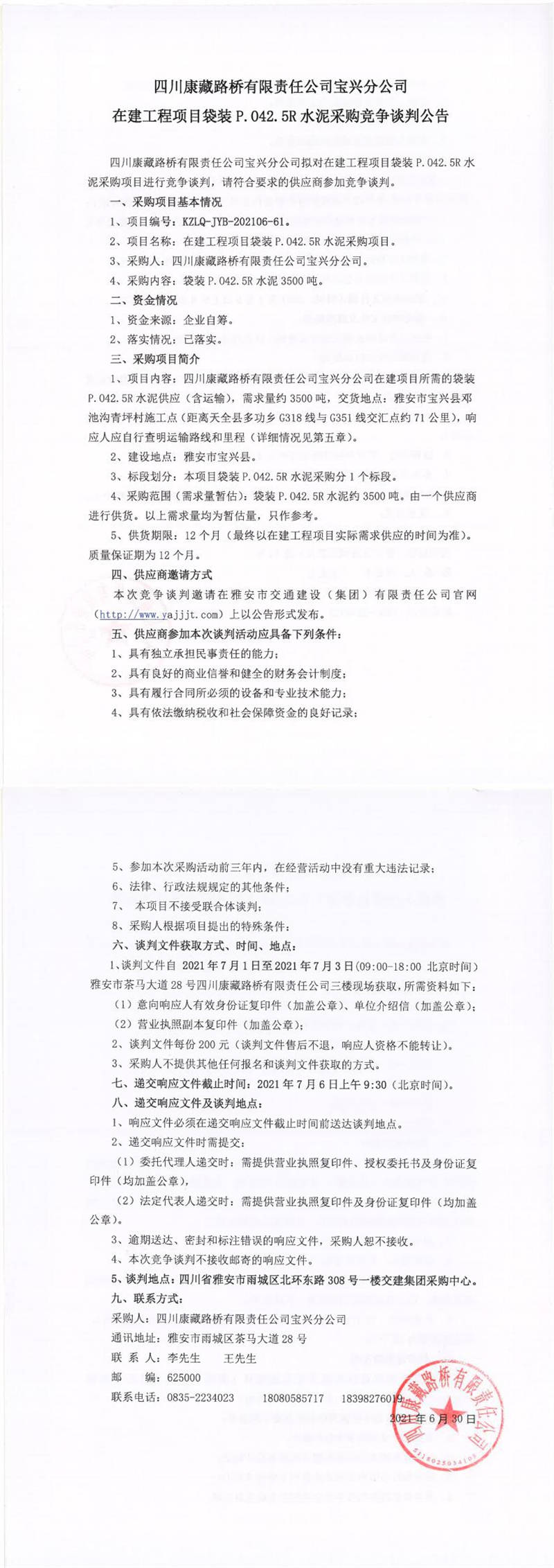 四川康藏路橋有限責(zé)任公司寶興分公司在建工程項目袋裝P.042.5R水泥采購競爭談判公告
