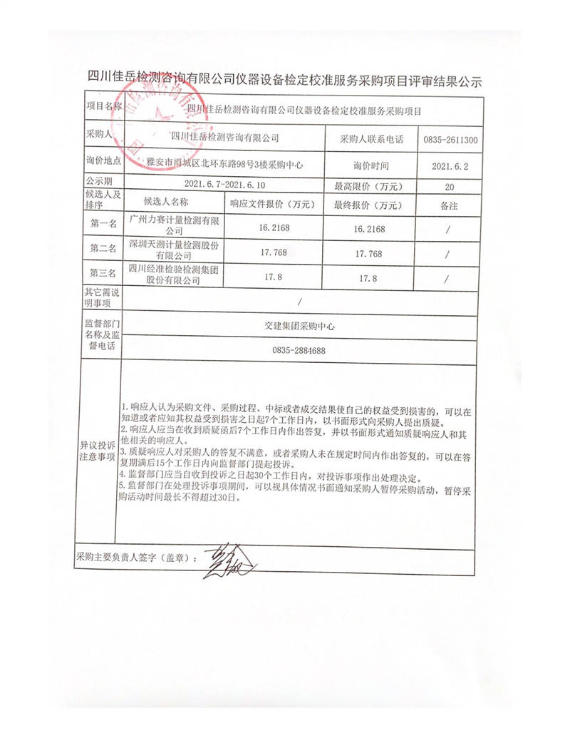 四川佳岳檢測咨詢有限公司儀器設備檢定校準服務采購項目評審結果公示