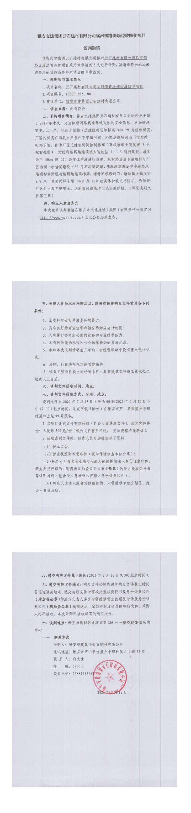 雅安交建集團(tuán)云石建材有限公司臨河側(cè)路堤墻邊坡防護(hù)項(xiàng)目競爭談判公告