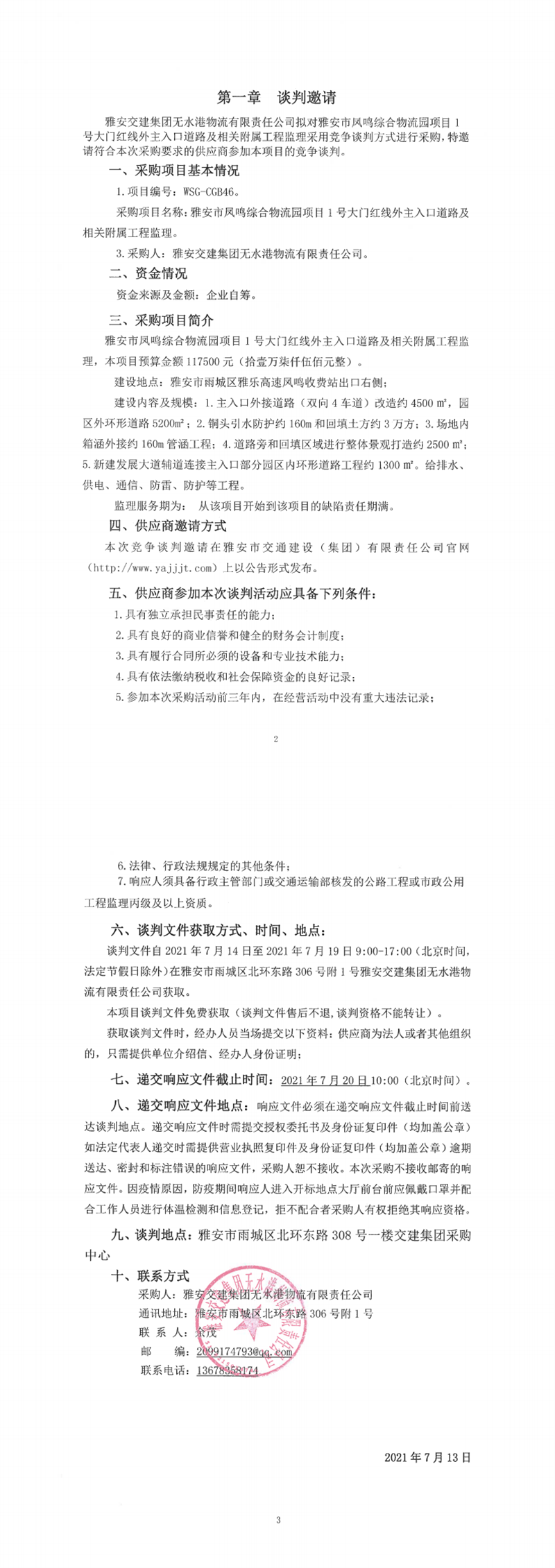 雅安交建集團(tuán)無水港物流有限責(zé)任公司雅安市鳳鳴綜合物流園項(xiàng)目1號(hào)大門紅線外主入口道路及相關(guān)附屬工程監(jiān)理競爭談判公告