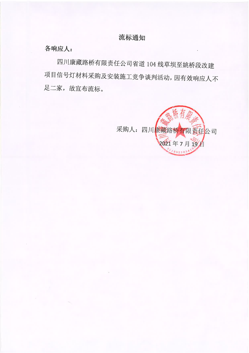 四川康藏路橋有限責(zé)任公司省道104線草壩至姚橋段改建項(xiàng)目信號(hào)燈材料采購及安裝施工競爭談判流標(biāo)通知