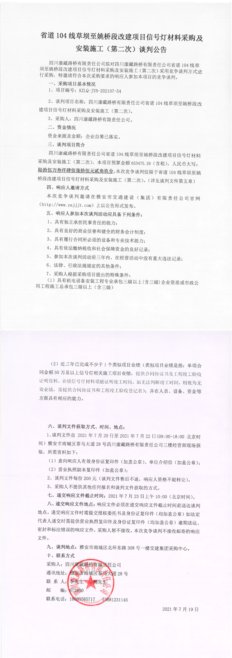 四川康藏路橋有限責(zé)任公司省道104線草壩至姚橋段改建項(xiàng)目信號(hào)燈材料采購(gòu)及安裝施工(第二次)談判公告