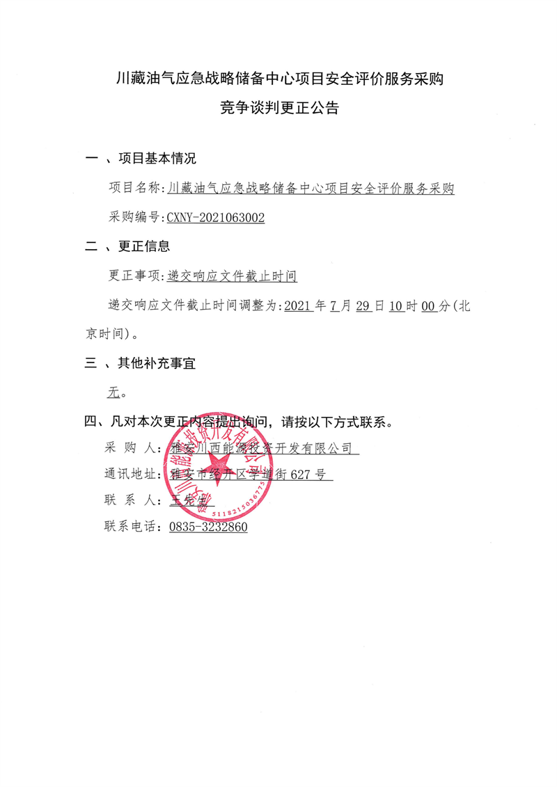 雅安川西能源投資開發(fā)有限公司川藏油氣應(yīng)急戰(zhàn)略儲(chǔ)備中心項(xiàng)目安全評(píng)價(jià)服務(wù)采購競(jìng)爭(zhēng)談判更正公告