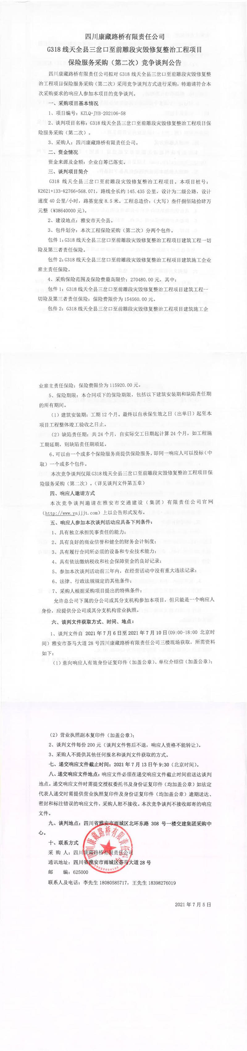 四川康藏路橋有限責(zé)任公司G318線(xiàn)天全縣三岔口至前雕段災(zāi)毀修復(fù)整治工程項(xiàng)目保險(xiǎn)服務(wù)采購(gòu)(第二次)競(jìng)爭(zhēng)談判公告