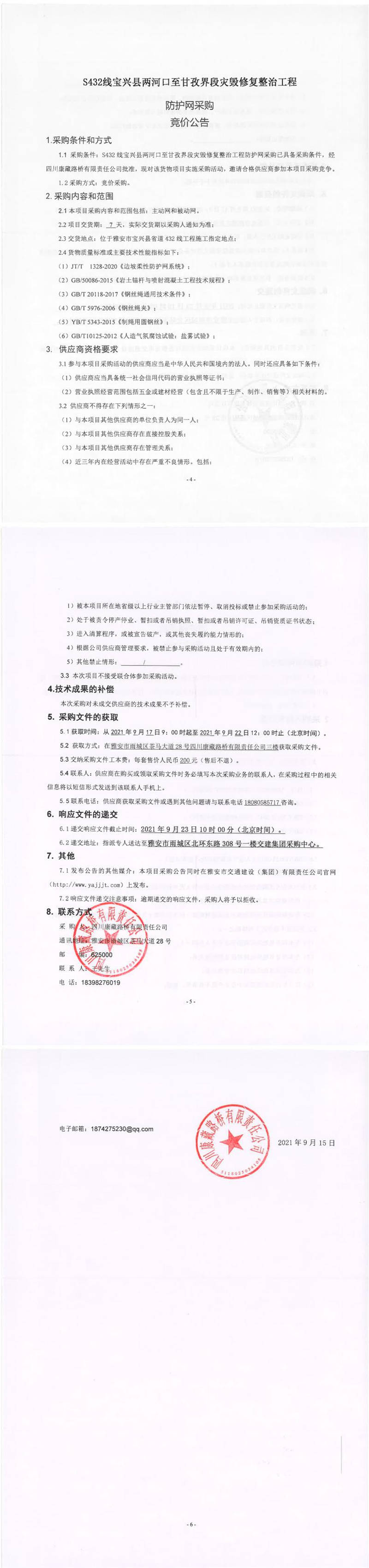 四川康藏路橋有限責(zé)任公司S432線(xiàn)寶興縣兩河口至甘孜界段災(zāi)毀修復(fù)整治工程防護(hù)網(wǎng)采購(gòu)競(jìng)價(jià)公告
