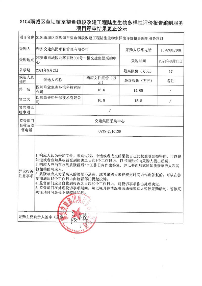雅安交建集團(tuán)項(xiàng)目管理有限公司S104雨城區(qū)草壩鎮(zhèn)至望魚鎮(zhèn)段改建工程陸生生物多樣性評價報告編制服務(wù)項(xiàng)目評審結(jié)果更正公示