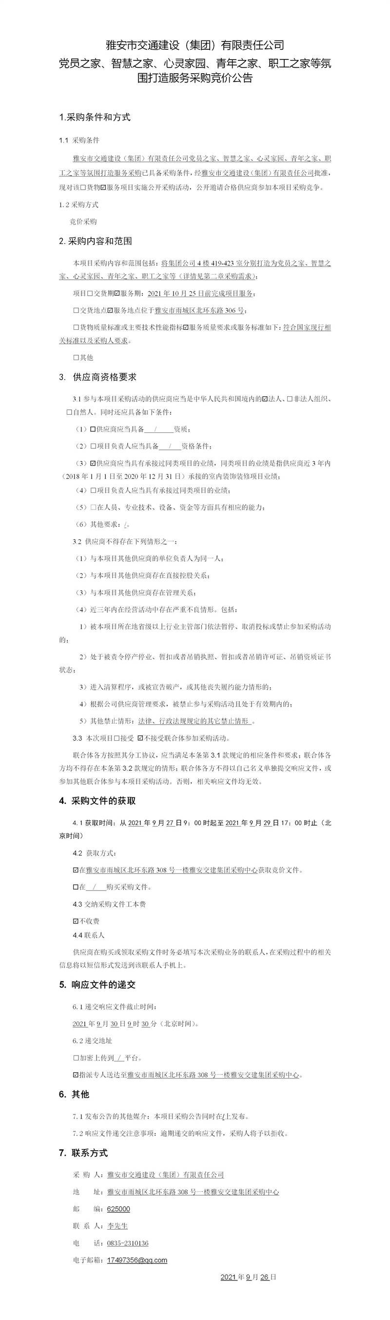 雅安市交通建設(shè)(集團(tuán))有限責(zé)任公司黨員之家、智慧之家、心靈家園、青年之家、職工之家等氛圍打造服務(wù)采購(gòu)競(jìng)價(jià)公告
