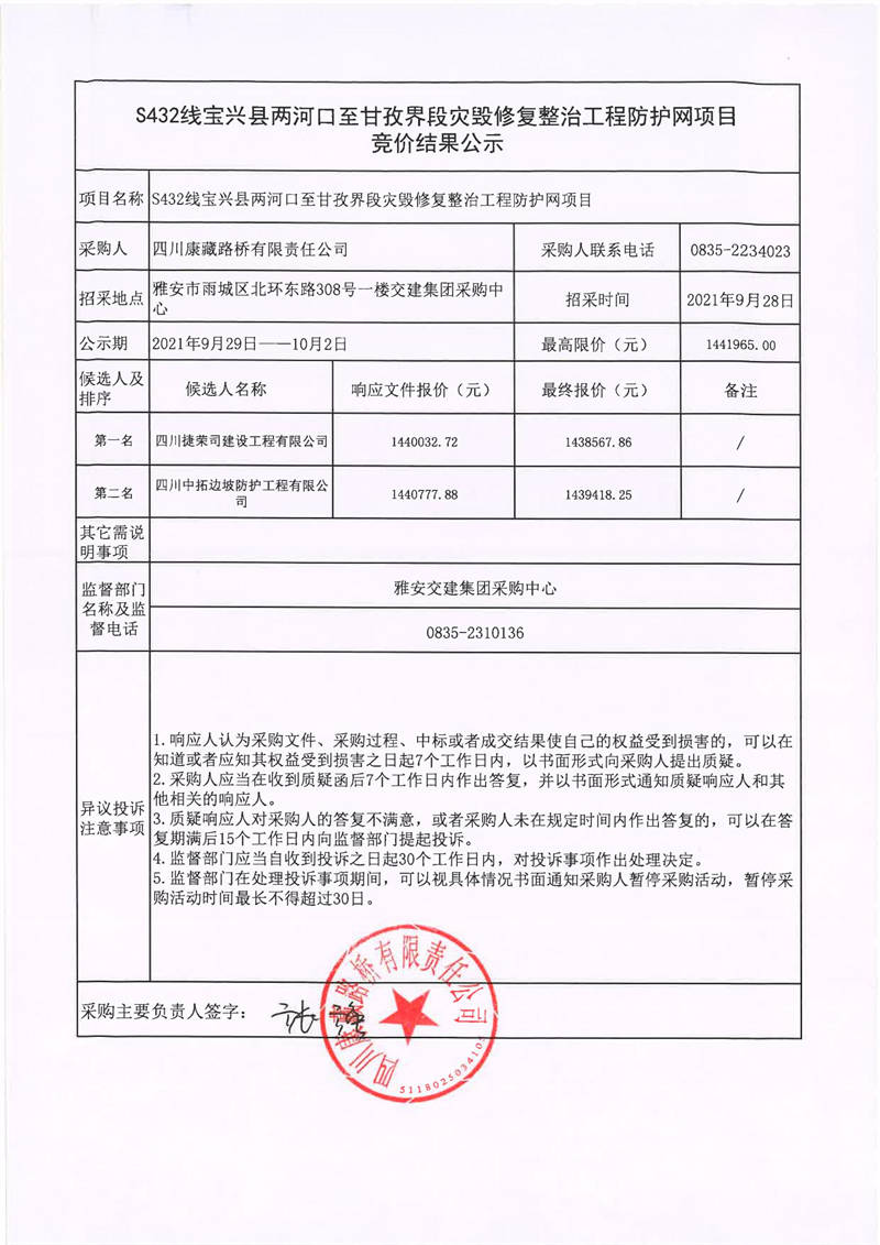 四川康藏路橋有限責任公司S432線寶興縣兩河口至甘孜界段災毀修復整治工程防護網(wǎng)項目競價結果公示