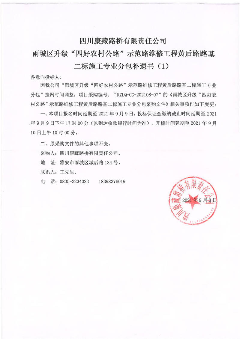 四川康藏路橋有限責任公司雨城區(qū)升級“四好農材公路”示范路維修工程黃后路路基二標施工專業(yè)分包補遺書(1)