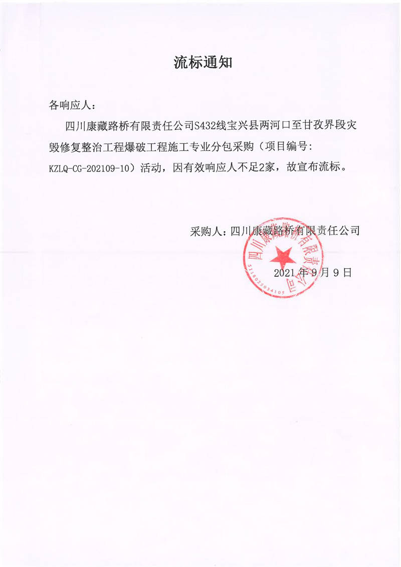 四川康藏路橋有限責(zé)任公司S432線寶興縣兩河口至甘孜界段災(zāi)毀修復(fù)整治工程爆破工程施工專(zhuān)業(yè)分包采購(gòu)流標(biāo)通知