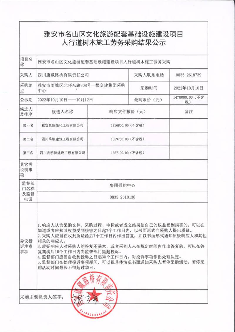 四川康藏路橋有限責(zé)任公司雅安市名山區(qū)文化旅游配套基礎(chǔ)設(shè)施建設(shè)項(xiàng)目人行道樹木施工勞務(wù)采購結(jié)果公示