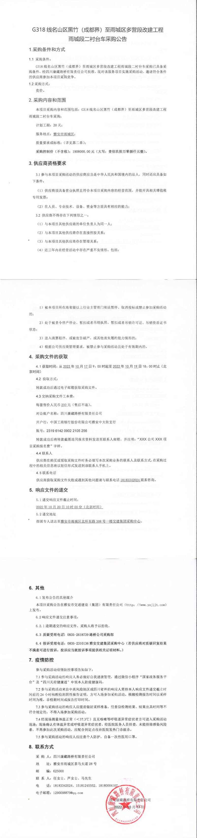 四川康藏路橋有限責(zé)任公司G318線名山區(qū)黑竹(成都界)至雨城區(qū)多營段改建工程雨城段二襯臺車采購公告