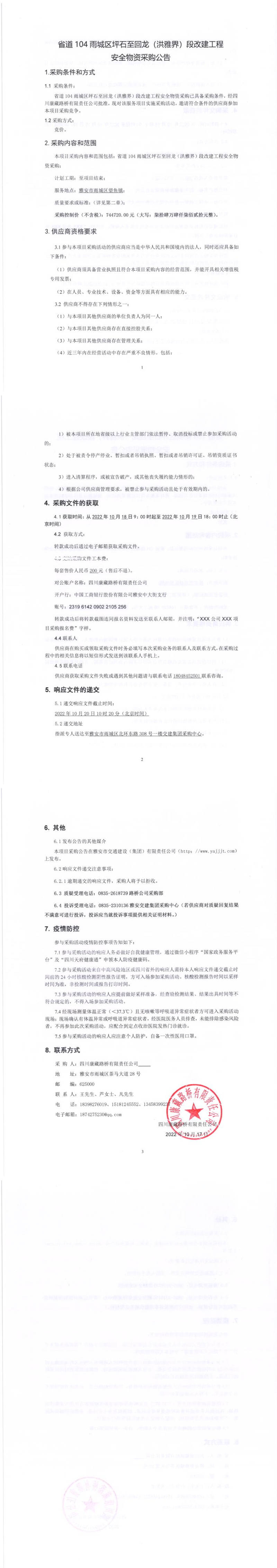 四川康藏路橋有限責(zé)任公司省道104雨城區(qū)坪石至回龍(洪雅界)段改建工程項目安全物資采購公告