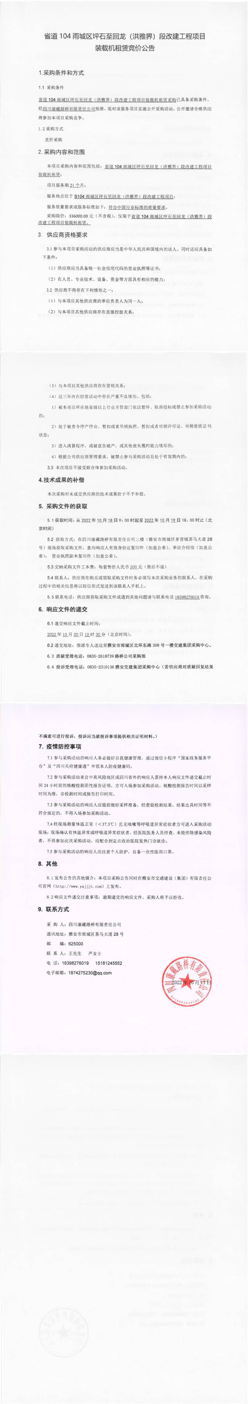 四川康藏路橋有限責任公司省道104雨城區(qū)坪石至回龍(洪雅界)段改建工程項目裝載機租賃競價公告