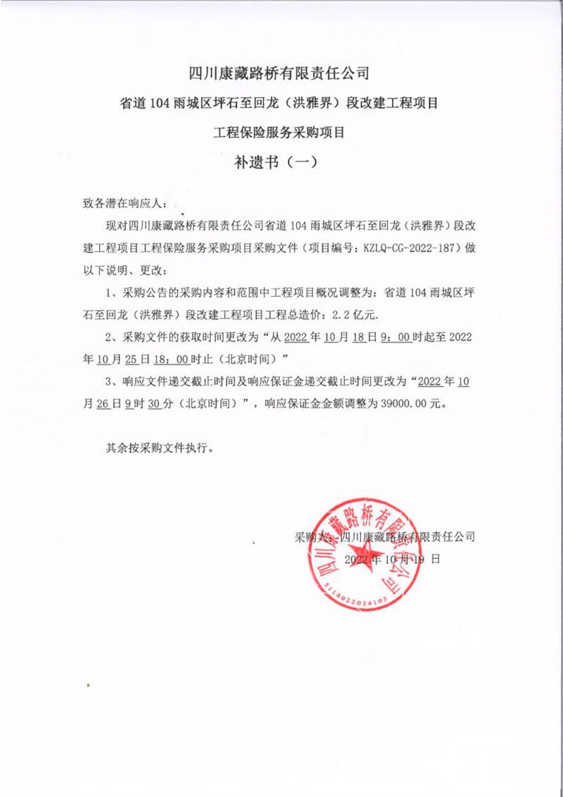 四川康藏路橋有限責(zé)任公司省道104雨城區(qū)坪石至回龍(洪雅界)段改建工程項(xiàng)目工程保險服務(wù)采購項(xiàng)目補(bǔ)遺書(一)