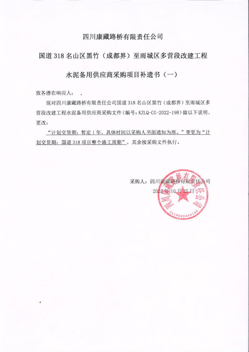 四川康藏路橋有限責(zé)任公司國道318名山區(qū)黑竹(成都界)至雨城區(qū)多營段改建工程水泥備用供應(yīng)商采購項目補(bǔ)遺書(一)