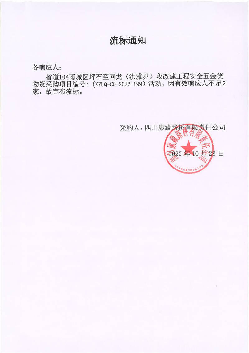 四川康藏路橋有限責(zé)任公司省道104雨城區(qū)坪石至回龍(洪雅界)段改建工程安全五金類物資采購項目流標通知