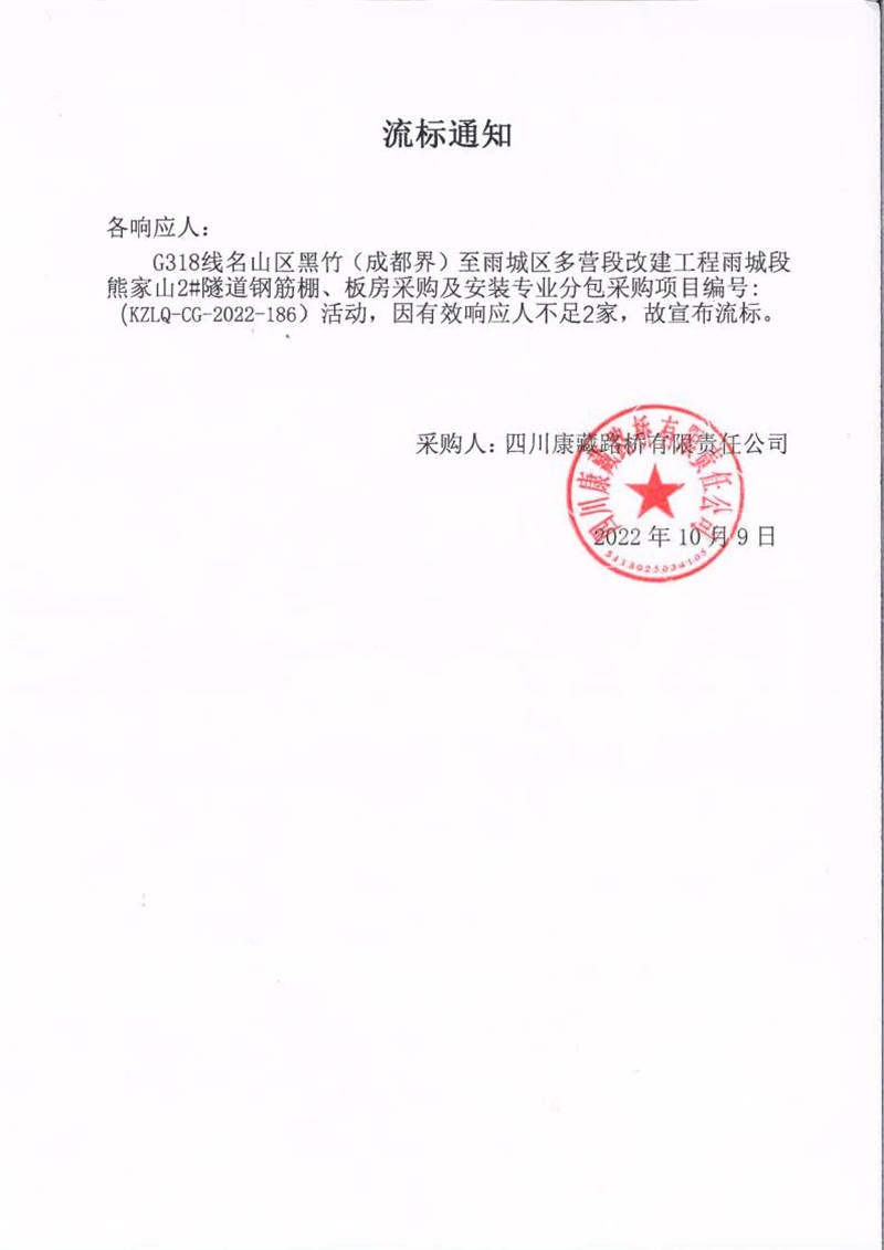 四川康藏路橋有限責(zé)任公司G318線(xiàn)名山區(qū)黑竹(成都界)至雨城區(qū)多營(yíng)段改建工程雨城段熊家山2#隧道鋼筋棚、板房采購(gòu)及安裝專(zhuān)業(yè)分包采購(gòu)項(xiàng)目流標(biāo)通知