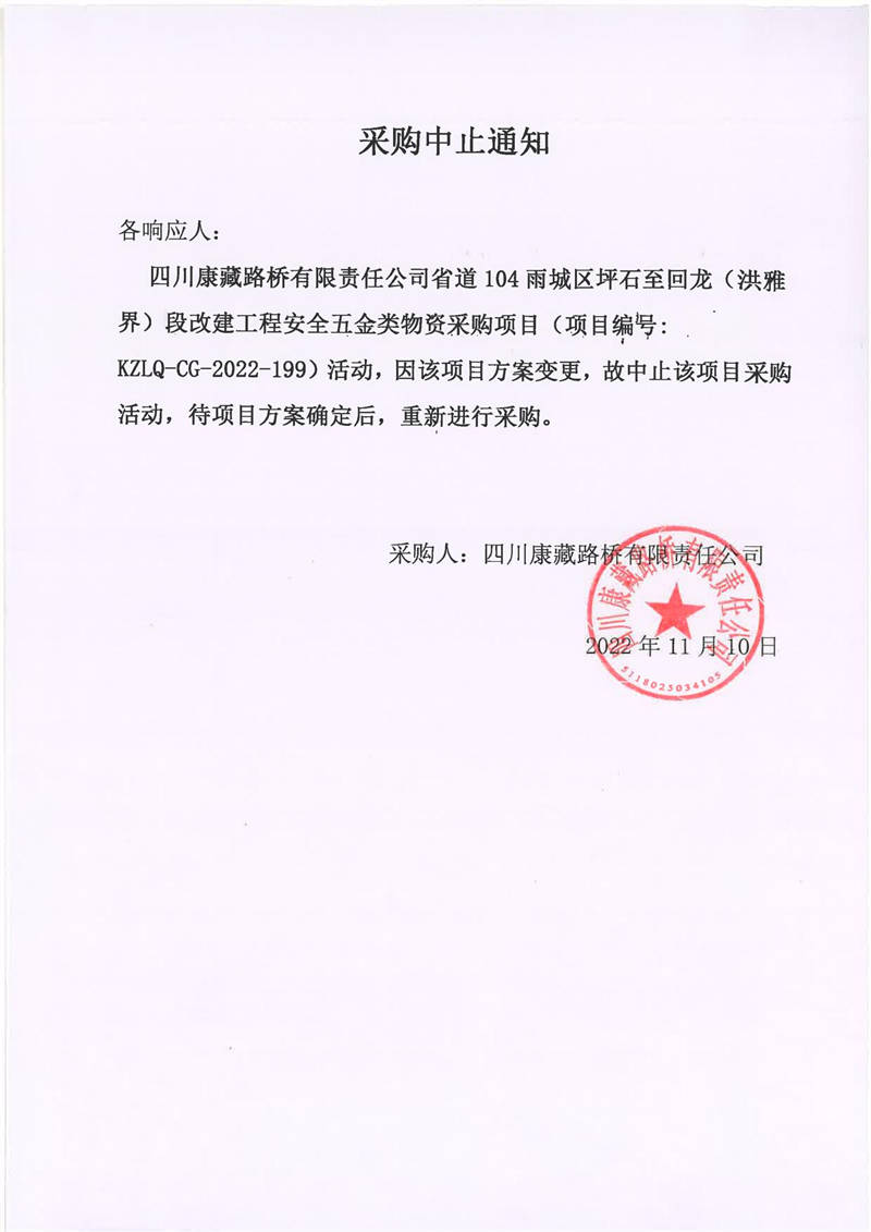 四川康藏路橋有限責(zé)任公司省道104雨城區(qū)坪石至回龍(洪雅界)段改建工程安全五金類物資采購(gòu)項(xiàng)目采購(gòu)中止通知
