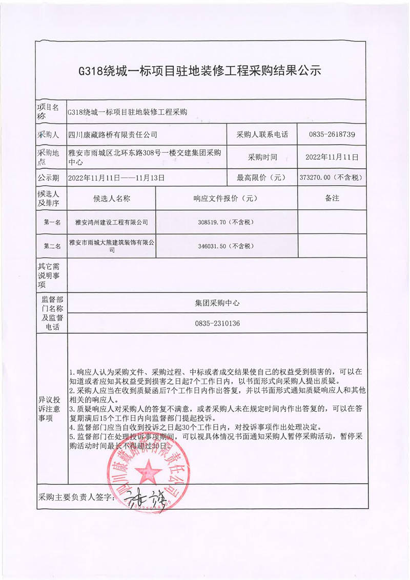 四川康藏路橋有限責(zé)任公司G318繞城一標項目駐地裝修工程采購結(jié)果公示