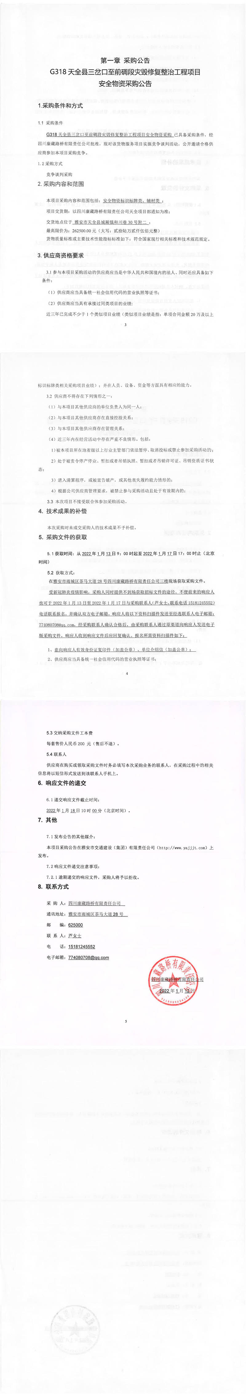四川康藏路橋有限責任公司G318天全縣三岔口至前碉段災毀修復整治工程項目安全物資采購公告