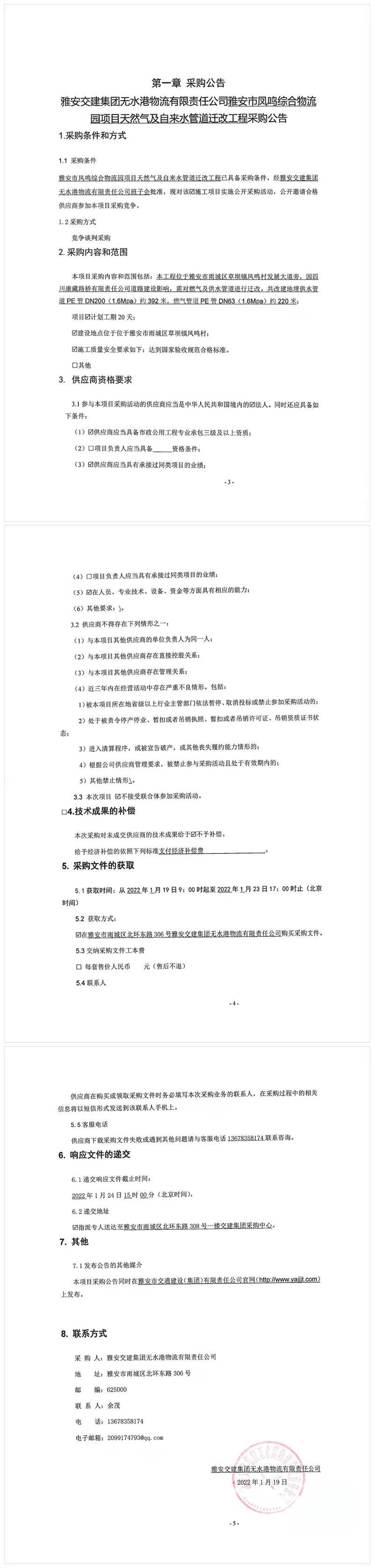 雅安交建集團(tuán)無水港物流有限責(zé)任公司雅安市鳳鳴綜合物流園項(xiàng)目天然氣及自來水管道遷改工程采購公告