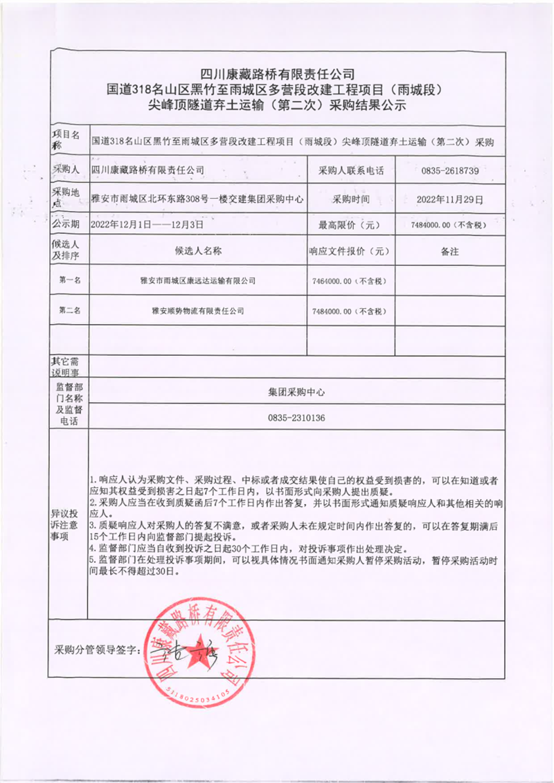 四川康藏路橋有限責任公司國道318名山區(qū)黑竹至雨城區(qū)多營段改建工程項目(雨城段)尖峰頂隧道棄土運輸(第二次)采購結(jié)果公示