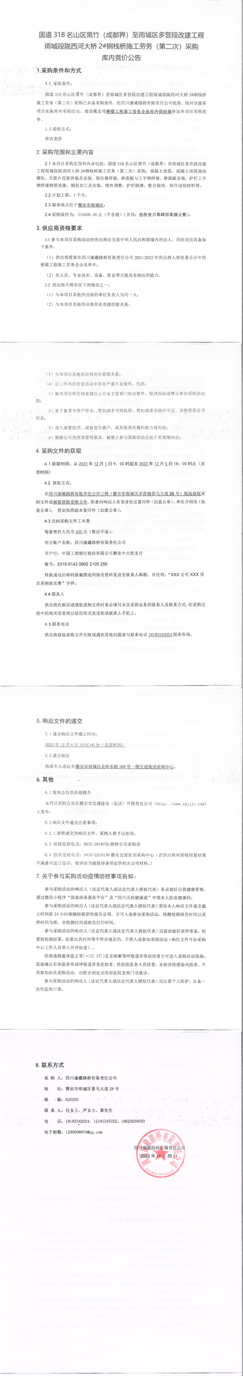 四川康藏路橋有限責(zé)任公司國(guó)道318名山區(qū)黑竹(成都界)至雨城區(qū)多營(yíng)段改建工程雨城段隴西河大橋2#鋼棧橋施工勞務(wù)(第二次)采購(gòu)庫(kù)內(nèi)競(jìng)價(jià)公告