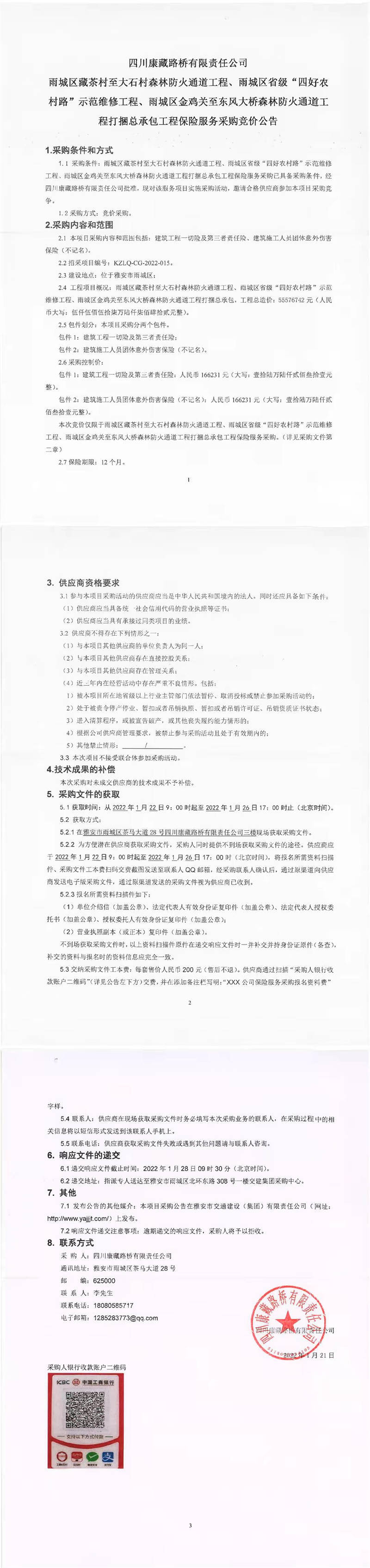 四川康藏路橋有限責(zé)任公司雨城區(qū)藏茶村至大石村森林防火通道工程、雨城區(qū)省級(jí)“四好農(nóng)村路”示范維修工程、雨城區(qū)金雞關(guān)至東風(fēng)大橋森林防火通道工程打捆總承包工程保險(xiǎn)服務(wù)采購(gòu)競(jìng)價(jià)公告
