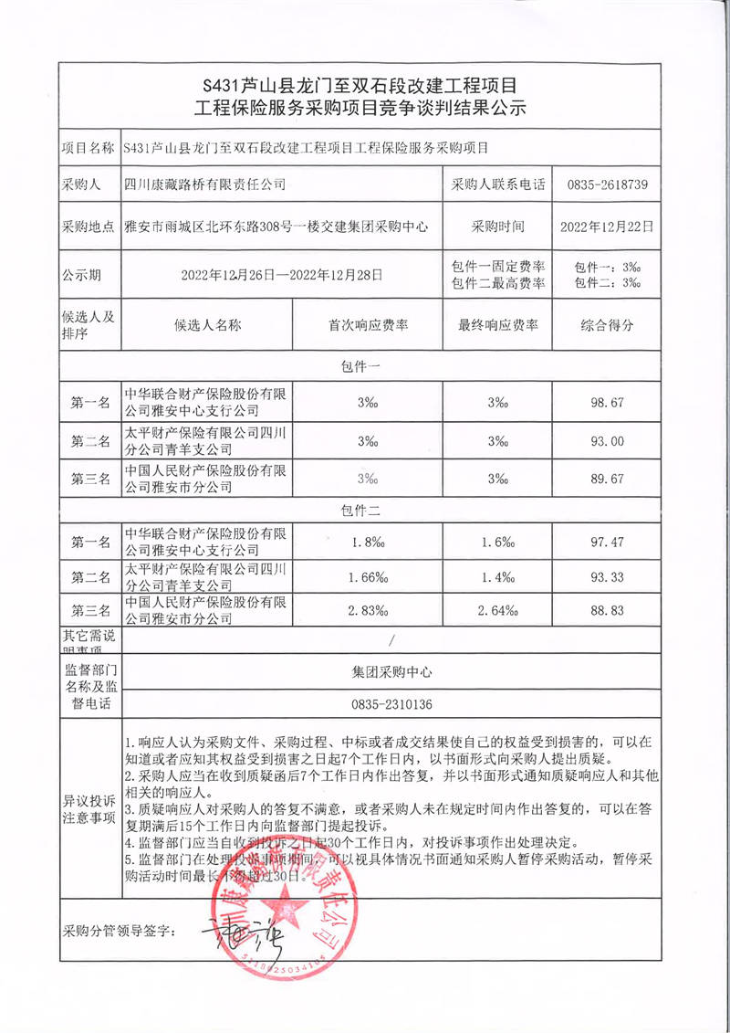 四川康藏路橋有限責任公司S431蘆山縣龍門至雙石段改建工程項目工程保險服務(wù)采購項目競爭談判結(jié)果公示