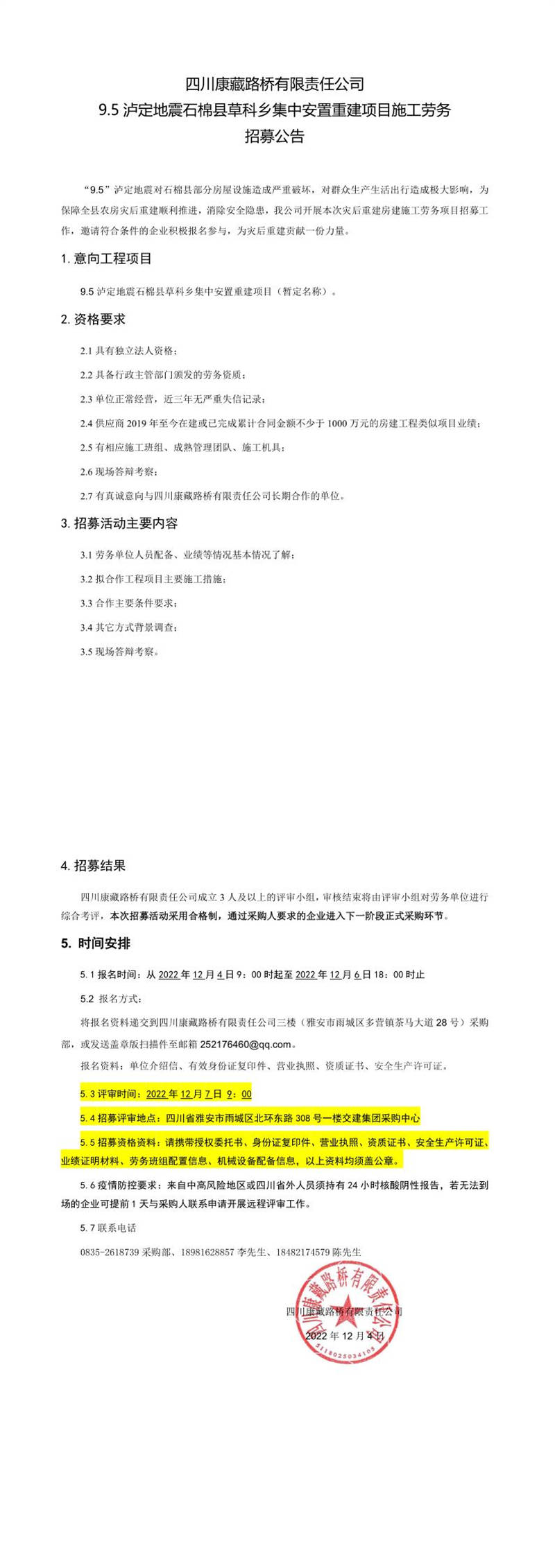 四川康藏路橋有限責任公司9.5瀘定地震石棉縣草科鄉(xiāng)集中安置重建項目施工勞務招募公告