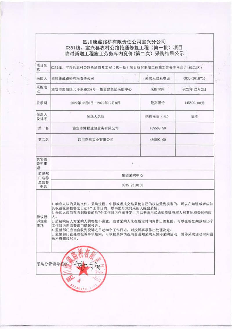四川康藏路橋有限責(zé)任公司寶興分公司G351線(xiàn)、寶興縣農(nóng)村公路搶通修復(fù)工程(第一批)項(xiàng)目臨時(shí)新增工程施工勞務(wù)庫(kù)內(nèi)競(jìng)價(jià)(第二次)采購(gòu)結(jié)果公示