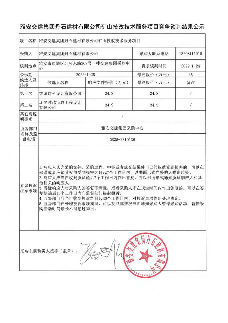 雅安交建集團丹石建材有限公司礦山技改技術服務項目競爭談判結(jié)果公示