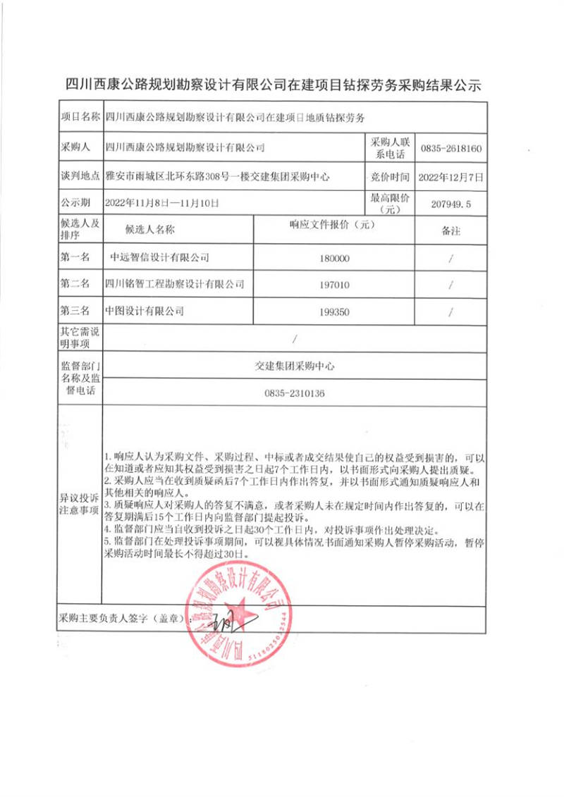 四川西康公路規(guī)劃勘察設(shè)計有限公司在建項目地質(zhì)鉆探勞務采購結(jié)果公示