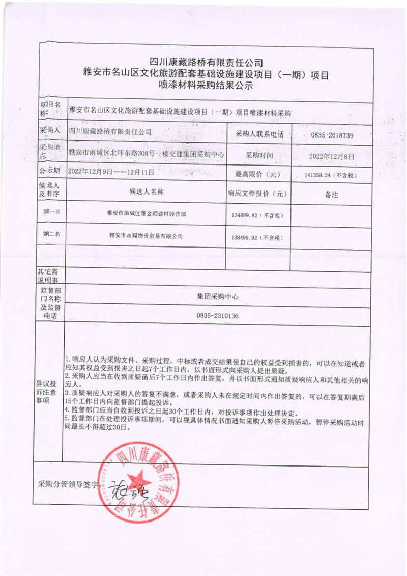 四川康藏路橋有限責(zé)任公司雅安市名山區(qū)文化旅游配套基礎(chǔ)設(shè)施建設(shè)項目(一期)項目噴漆材料采購結(jié)果公示