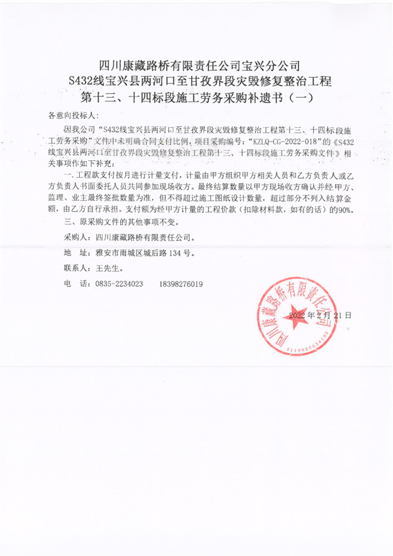 四川康藏路橋有限責任公司寶興分公司S432線寶興縣兩河口至甘孜界段災毀修復整治工程第十三、十四標段施工勞務(wù)采購補遺書(一)