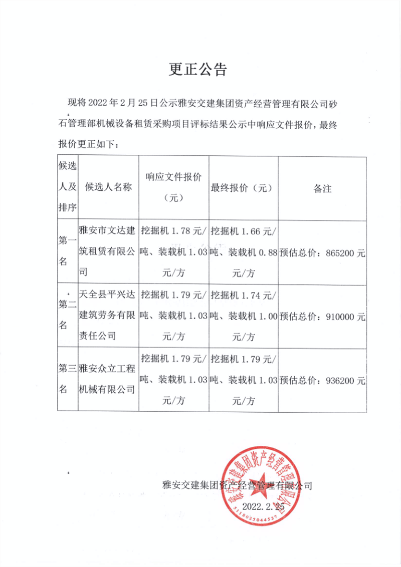 雅安交建集團資產(chǎn)經(jīng)營管理有限公司砂石管理部機械設備租賃采購項目評標結果公示更正公告