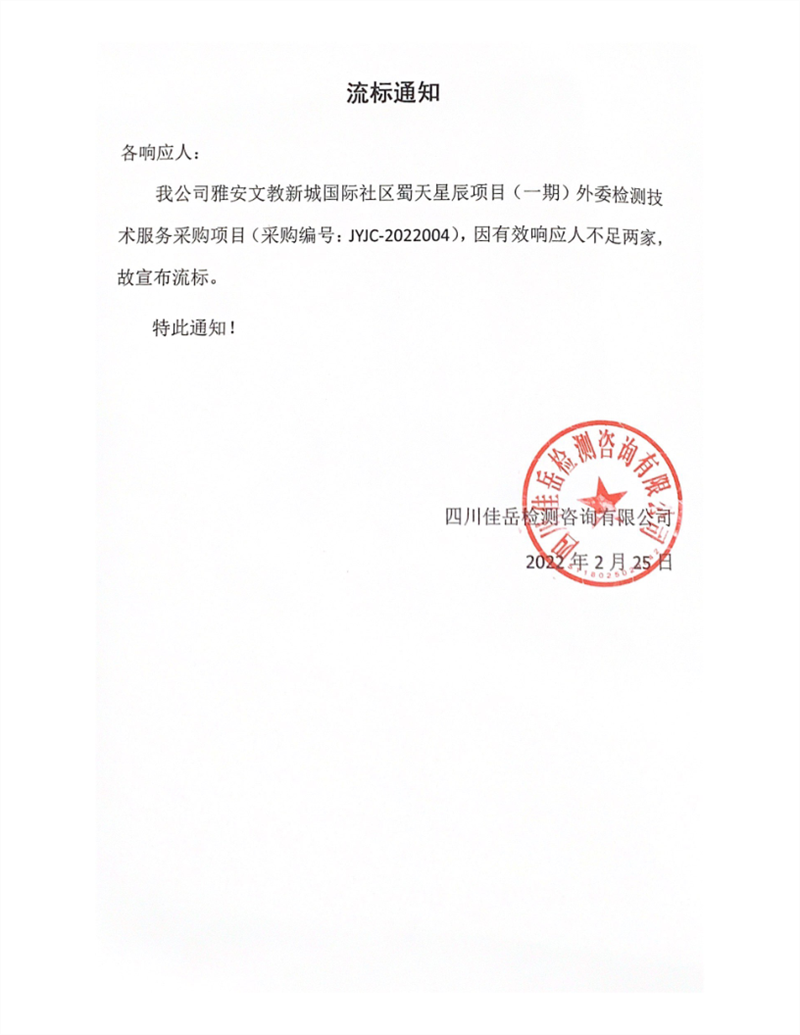 四川佳岳檢測咨詢有限公司雅安文教新城國際社區(qū)蜀天星辰項(xiàng)目(一期)外委檢測服務(wù)采購項(xiàng)目流標(biāo)通知