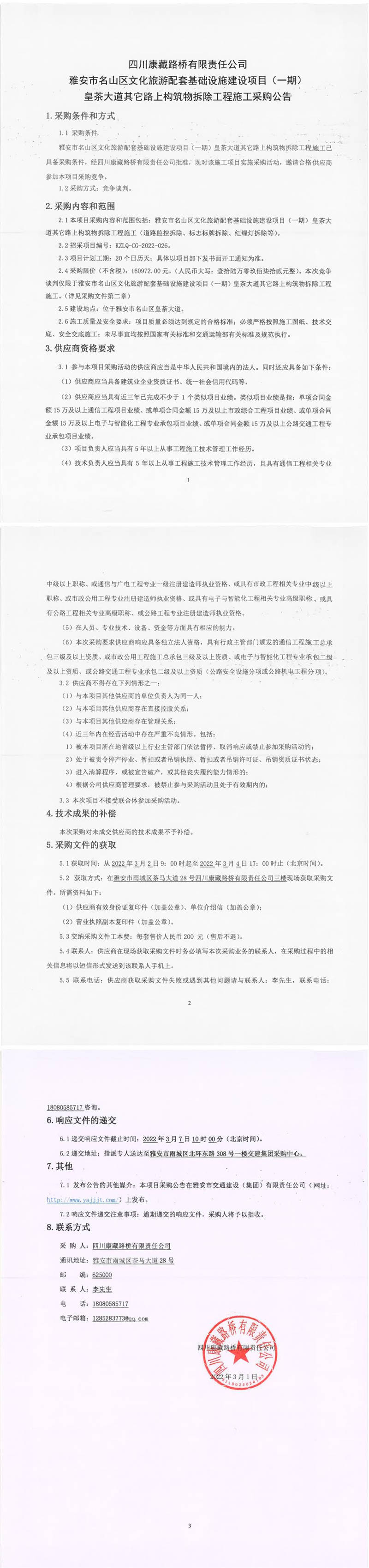 四川康藏路橋有限責任公司雅安市名山區(qū)文化旅游配套基礎設施建設項目(一期)皇茶大道其它路上構(gòu)筑物拆除工程施工采購公告