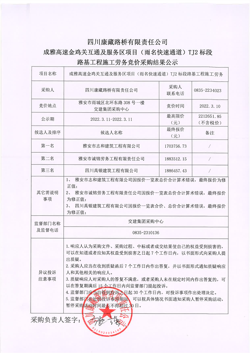 四川康藏路橋有限責(zé)任公司成雅高速金雞關(guān)互通及服務(wù)區(qū)項目(雨名快速通道)TJ2標(biāo)段路基工程施工勞務(wù)競價采購結(jié)果公示