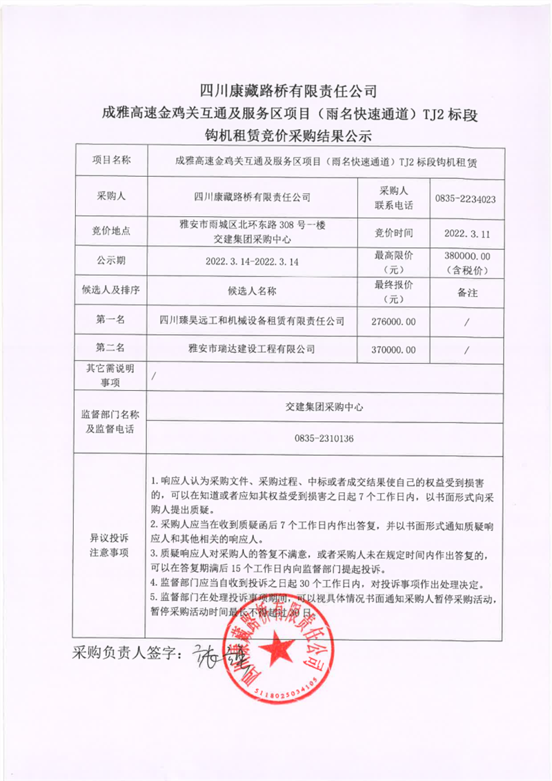 四川康藏路橋有限責(zé)任公司成雅高速金雞關(guān)互通及服務(wù)區(qū)項目(雨名快速通道)TJ2標段鉤機租賃競價采購結(jié)果公示