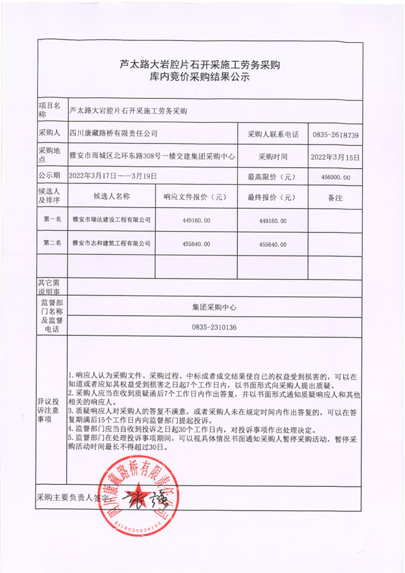 四川康藏路橋有限責(zé)任公司蘆太路大巖腔片石開采施工勞務(wù)采購庫內(nèi)競價(jià)采購結(jié)果公示