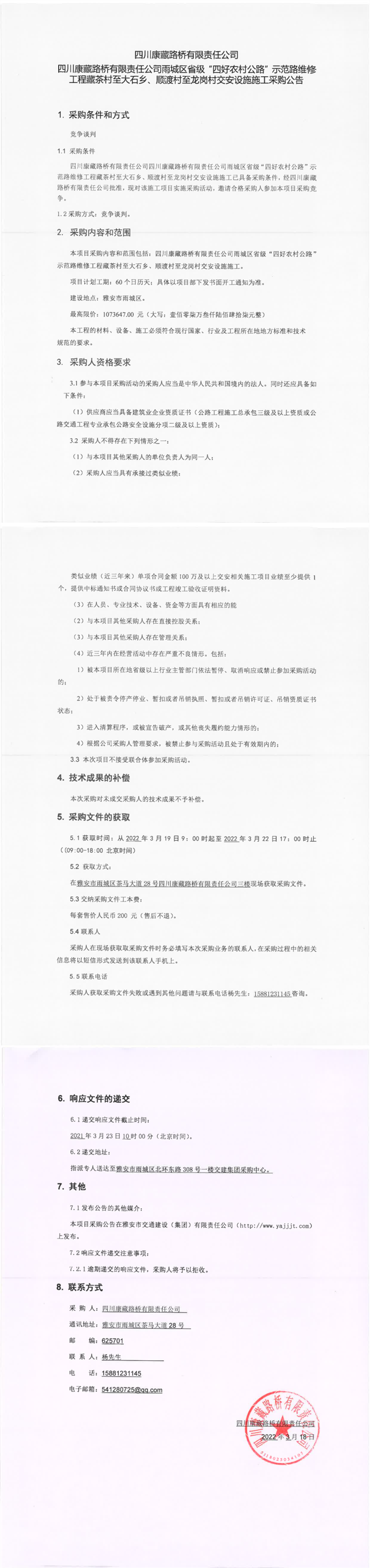 四川康藏路橋有限責(zé)任公司雨城區(qū)省級(jí)“四好農(nóng)村公路”示范路維修工程藏茶村至大石鄉(xiāng)、順渡村至龍崗村交安設(shè)施施工采購(gòu)公告