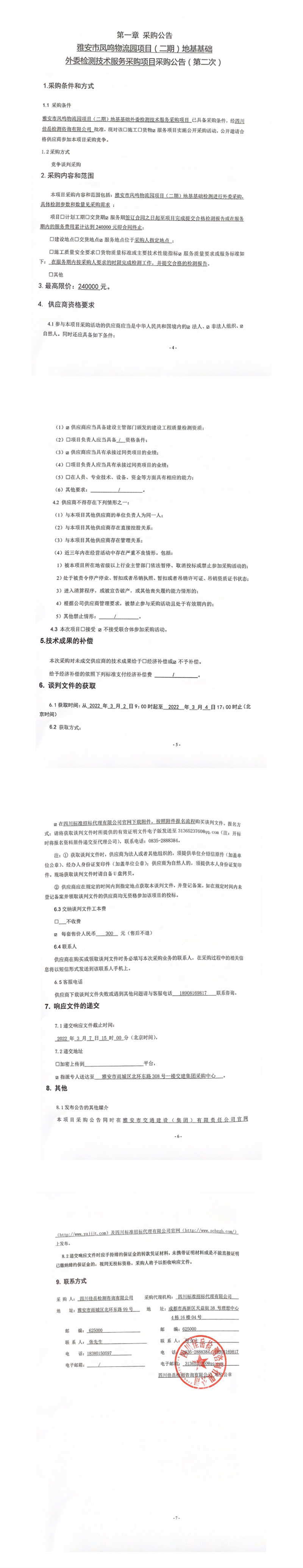 四川佳岳檢測咨詢有限公司雅安市鳳鳴物流園項目(二期)地基基礎外委檢測技術服務采購項目采購公告(第二次)