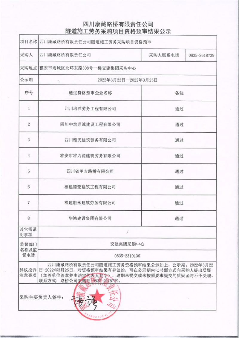 四川康藏路橋有限責(zé)任公司隧道施工勞務(wù)采購項目資格預(yù)審結(jié)果公示