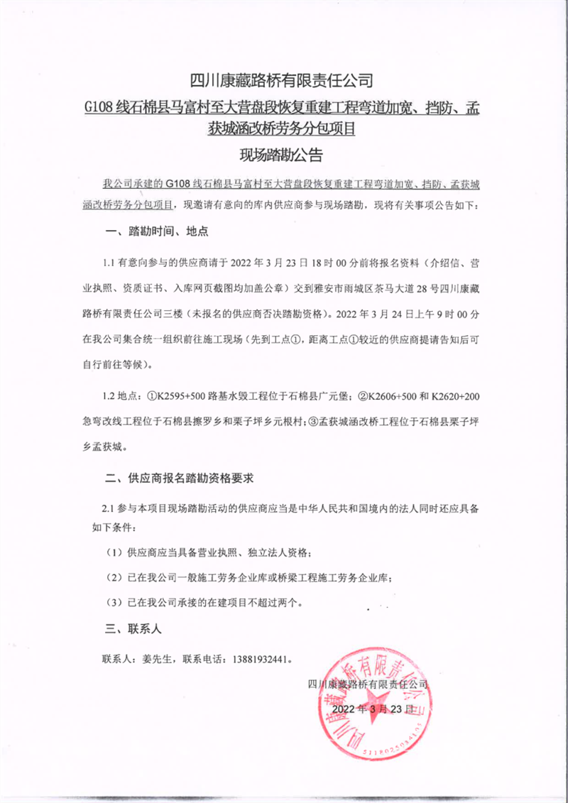 四川康藏路橋有限責(zé)任公司G108線石棉縣馬富村至大營盤段恢復(fù)重建工程彎道加寬、擋防、孟獲城涵改橋勞務(wù)分包項(xiàng)目現(xiàn)場踏勘公告