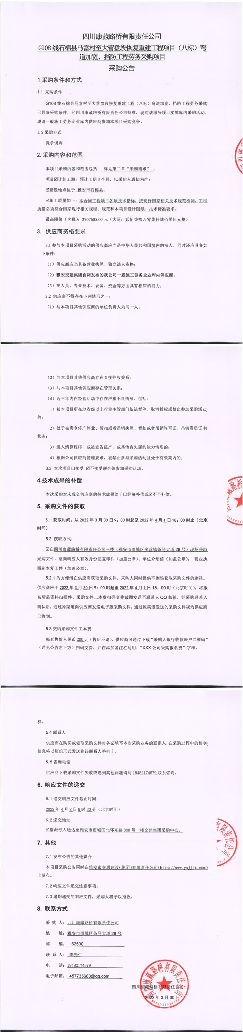四川康藏路橋有限責(zé)任公司G108線石棉縣馬富村至大營盤段恢復(fù)重建工程(八標(biāo))彎道加寬、擋防工程勞務(wù)采購項(xiàng)目采購公告
