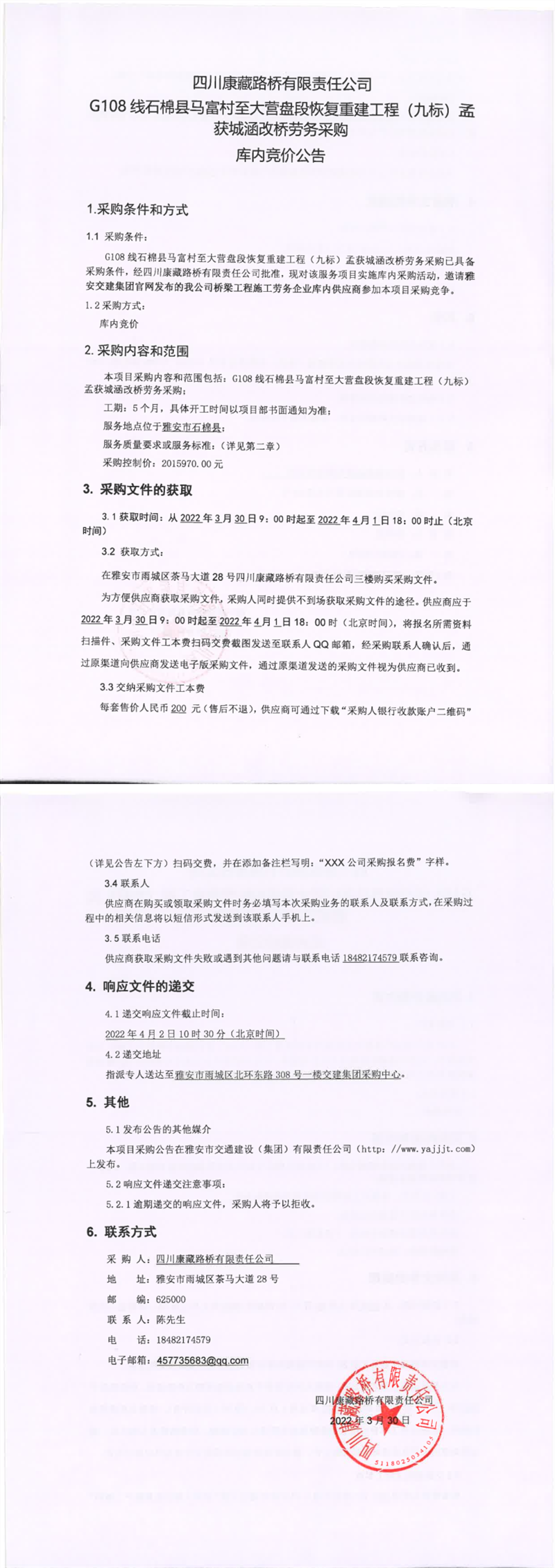 四川康藏路橋有限責(zé)任公司G108線石棉縣馬富村至大營(yíng)盤段恢復(fù)重建工程(九標(biāo))孟獲城涵改橋勞務(wù)采購庫內(nèi)競(jìng)價(jià)公告