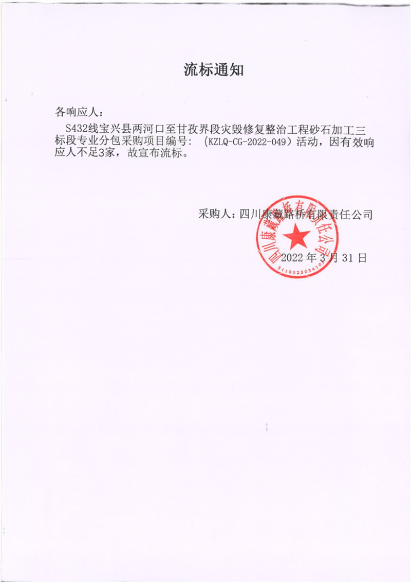 四川康藏路橋有限責(zé)任公司S432線寶興縣兩河口至甘孜界段災(zāi)毀修復(fù)整治工程砂石加工三標(biāo)段專業(yè)分包采購項(xiàng)目流標(biāo)通知